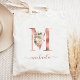 Ce sac fourre-tout élégant présente un grand monogramme en forme de lettre "M" en faux or rose, orné d'un bouquet floral en ivoire vintage agrémenté de feuillage vert et or rose. Personnalisez-le avec son nom écrit à la main en rose gold, avec des fioritures au début et à la fin. C'est le cadeau idéal pour une demoiselle d'honneur ! D'autres lettres de l'alphabet sont disponibles dans notre boutique Zazzle. (Pour conserver les fioritures, remplacez uniquement les lettres du nom.)
