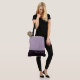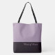 Ce charmant sac fourre-tout à la mode affiche le mot "Maid of Honor" (demoiselle d'honneur) en texte blanc sur un fond de couleur pourpre-améthyste sombre et fumé avec le haut du sac en couleur Prune Sucrée personnalisée. Il y a amplement de place pour du texte personnalisé. Les graphiques et le texte sont sur les deux côtés de ce sac fourre-tout. Anse noire. Personnalisez davantage ou achetez tel quel.