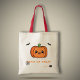 Un sac fourre-tout d'Halloween avec un citrouille mignon dans le style Kawaii, chauves-souris, chat noir et personnalisable "Trick or Treat" texte et nom. Parfait pour la nuit d'Halloween pour effrayer vos voisins et leur demander des bonbons !