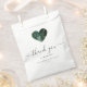 Ces élégants sacs de faveur de mariage modernes ont une forme de coeur remplie d'une aquarelle vert émeraude et de la conception de parties scintillant en faux or. Les mots "merci" apparaissent dans un élégant script d'écriture manuscrite gris charbon avec des swashes au début et à la fin. Customisez le message et ajoutez les noms du couple et de la date du mariage.