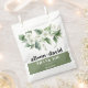Ce sac de faveur de mariage fleuri présente une belle branche ornée de fleurs blanches délicates et de verdure luxuriante. Les noms du couple sont affichés en caractères gras, ajoutant une touche personnelle au design. Un message de "Merci" sincère est également inclus, ce qui en fait un gage de satisfaction pour les clients. De plus, un élégant groupe de sauge verte au bas cravate l'ensemble de l'apparence ensemble, créant une esthétique cohésive et élégante pour l'occasion spéciale.