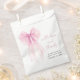 Jolie petite fille douche merci préférez les sacs avec une grande coquette arc rose aquarelle, "avec amour et merci" dans un script rose chic, et le nom de la future mère et la date de douche en lettres modernes simples.