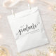 Un élégant sac de remise de diplômes moderne. Ces sacs de faveur de la fête de remerciement ont un thème simple noir et blanc avec une police de script élégante. Ajoutez le nom des diplômés et le lycée ou l'université pour le sac de faveur de la fête de graduation personnalisée parfaite.