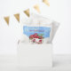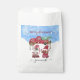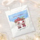 "Joyeux Snowing Gnome Red Truck Watercolor Favor Bag." Un arrière - plan enneigé de jour d'hiver est jumelé à une jolie famille Gnome qui gère une ferme d'arbres. Reindeer et camion de ferme rouge avec texte typographique qui dit : "Joyeux Noël, Gnomies !" Art peint en aquarelle par Audrey Jeanne Roberts, artiste et designer de renommée internationale, copyright.