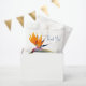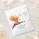 Sacs de faveur de mariage en vrac avec oiseau orange de design paradis. Personnalisez les sacs blancs (env. 5x8 pouces, en paquets de 50 sacs) avec un message d'appréciation aux clients mariages. Grosse fleur hawaïenne design avec texte imprimé bleu foncé. Exemple de message : "Nous sommes tellement reconnaissants que vous soyez ici aujourd'hui pour partager notre joie. Amour et remerciements, (noms)"