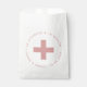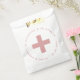 Pour le kit d'urgence (aka kit de survol) à mettre dans un sac d'accueil de mariage de destination, avec un peu de médicament à l'intérieur. Il a une croix au centre et du texte voûté faisant un cercle autour. Au-dessus, il y a le message "En maladie et en santé" et en-dessous il y a les noms de la mariée et du marié et la date. Le texte est en petits casquette. Le texte et la croix sont rose (rose) poussiéreux, l'arrière - plan est blanc.