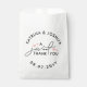 Sacs de mariage en blanc avec un design de typographie noire et des coeurs roses. Sacs de faveur de mariage mignons pour gâteries et bonbons avec un Merci doux dans une belle conception typographique. Sacs de mariage blanc avec texte noir et petits coeurs roses. Mariage traitez les autocollants de faveur en blanc, noir et rose. Mariage traite les sacs personnalisés avec vos noms et date mariage en texte courbe.