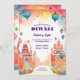 Die Vorderseite der Einladung zeichnet sich durch einen sanften Aquarellhintergrund mit sanften Lichtfarben aus, der ein ruhiges und ätherisches Ambiente schafft. Zwei wunderschön illustrierte Hindu-Tempel stehen auf beiden Seiten des Designs, gerahmt von zarten, handbemalten Hindu-Dekorationen. Die sanften Pastelltöne harmonieren harmonisch mit dem weißen Hintergrund und verleihen dem Ganzen eine luftige und ruhige Atmosphäre. Die Details der Veranstaltung sind elegant in der Mitte gestaltet, umgeben von komplizierten Mustern, die traditionelles Handwerk anregen. Die Rückseite der Karte setzt das Aquarellmotiv fort und bietet Platz für den individuellen Text und Diwali Wünsche, mit subtilen dekorativen Akzenten, um das Design gemeinsam Krawatte. Diese Einladung strahlt Frieden und spirituelle Schönheit aus, perfekt um Diwali mit Anmut und Ehrfurcht zu feiern.