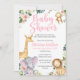 Un peu sauvage est en route, fêtons-nous avec une journée spéciale !! Ce baby shower présente un joli éléphant peint en aquarelle, une girafe, un lion et un singe. Il y a aussi des flores d'aquarelle autour du cadre de l'invitation. Les illustrations sont de StarJamforKids et FloraAndBear