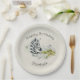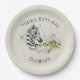 Exotische Wildtravel Thema glücklichen Geburtstag personalisierte Papiertafel mit gekrümmten Text. Ein niedliches Aquarelldesign mit einem schwarz-weiß gestreiften Zebra und einem grünen Savanne-Baum und grauen Aquarellfarben-Spritzern. Ein wildes und exotisches Design. Set auf weißem Hintergrund.Rved Äste mit extravaganten Blätter und Blattwerk.