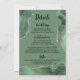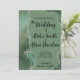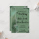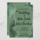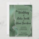Invitations de mariage avec tourbillon vert et design de parties scintillant argent sur un fond sage.