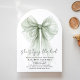 Charmante, bogenförmige Brautdusche mit einer schönen Aquarellfarbe eines großen Salbeigrün-Coquette-Bogens, "sie bindet den Knoten" in einer schicken Schrift, und der Name der Braut und die Duschdetails in einfachen, modernen Schriften.