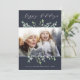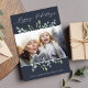 Festif et élégant dans les tons vert pâle, gris jade et blanc, notre carte photo de vacances Winter Sage présente votre photo préférée horizontale ou orientée paysage encadrée par des feuilles botaniques verts dessinés sur un arrière - plan bleu marine profond spectaculaire. "Happy Holidays" apparaît en haut dans le script de calligraphie moderne en lettres. Personnalisez avec votre salutation personnalisée, votre nom de famille ou vos noms, et l'année en bas.
