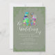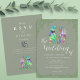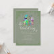 Make your wedding unforgettable with this unique sage green dinosaur wedding invitation featuring a charming psychedelic multicolored T-Rex bride and groom illustration in pink, blue, orange, green, yellow, orange, purple and teal. Perfect for couples who share a love of dinosaurs, this fun funky yet elegant wedding invite blends playful Jurassic personality with modern botanical style.