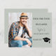 On front: Add your own vertical size photo of the graduate. A trendy muted sage green colored background, black text. Templates for a name and date. The name is written with a modern hand lettered style script. With a cap, tassel topper.