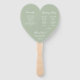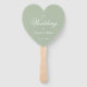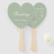 Ein schlichter, eleganter, herzförmiger Hochzeitsfan für eine schlaue grüne Hochzeitsfarbe. Die Titel und die Namen (und die Initialen) der Braut und des Bräutigams sind in einem eleganten kalligrafischen Skript, der Erholung in Kappen, geschrieben. Der Hintergrund ist sage grün, der Text ist weiß. Auf der Rückseite hat es auf der links Seite das Trauungsprogramm und, auf der rechten Seite, die Hochzeitsfeier (mit 2 verschiedenen Säulen für die Brautmannschaft und Bräutigam Team). und unter ihnen eine kurze Dankeschön Nachricht.