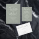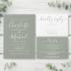 Alles in einer Hochzeitseinladung mit elegantem Signatur-Script-Namen und Monogramm-Initialen auf einem sage-grünen Hintergrund. Die Einladung enthält eine perforierte RSVP-Karte mit Ihrem Hochzeitswebsite QR Code. Entwickelt von Thisisnotme©