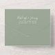 The left-hand edge of this elegant modern all-in-one wedding invitation and RSVP features a silver faux glitter border. The customizable text combines white whimsical handwriting, copperplate and italic fonts on a sage green background. The return address appears on the outside flap and the reverse side of the detachable RSVP card in white text on solid sage green. A QR code is included on the RSVP card for guests who would prefer to reply online.