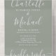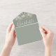 Alles in einer Hochzeitseinladung mit hübschen Saitenlichtern, prächtigen Stilbezeichnungen und schicker Typografie auf einem schlängelgrünen Hintergrund. Die Einladung enthält eine perforierte RSVP-Karte mit QR-Code. Entwickelt von Thisisnotme©