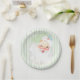 Diese pastellfarbenen Minze Vintage Frühlinggrün Winking Weihnachten Einwegpapier Party Dinner und Mittag / Salat Teller mit einer antiken Santa Claus Grafik, die neu gefärbt und neu erfunden wurde. Der Hintergrund ist ein monochromatisches tri-ton vertikales Stripmuster, ideal für jede niedliche Retro-Ansammlung.