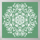 Dieses weiße Mandala liegt auf einem graugrünen Hintergrund. Die Farben sind natürlich und entspannend. Teil der Sammlung Pras Mandala.