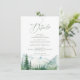 Watercolor lush green pine forest and misty mountain with sage modern script, elegant and romantic, great details cards with QR code for boho rustic wedding and mountain forest destination wedding in spring and summer.
