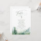Watercolor lush green pine forest and misty mountain with sage modern script, elegant and romantic, great personalized table seating cards for boho rustic wedding and mountain forest destination wedding in spring and summer.
