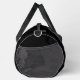This black duffle bag features four vertical panels with vibrant watercolor nautical elements, including a fish on an anchor, a sailboat, a fish with a seashell, and a lighthouse with a dolphin, all under the text "SAILING VIBES." Edit color of the bag caps and body in the Design tool to your favored colors.