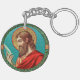 Vous avez deux options ici : 1) Laissez le porte - clé tel quel avec la même image de part et d'autre. Ou, 2) masquez ou supprimez l'image de l'Apôtre sur le dos pour révéler une zone vierge et de couleur solide prête à recevoir votre propre texte ou image. Pour choisir une nouvelle couleur arrière - plan et/ou texte, consultez les teintes de coordination suggérées sur la carte postale Palette de couleurs pour cette image. Les cartes postales Color Palette se trouvent dans la COLLECTION associée à une image et dans la COLLECTION spéciale consacrée uniquement aux palettes de couleurs. + Ce rond-point présente une Saint-Bartholomée pensive (aussi connue sous le nom de Nathaniel; 1er siècle) contemplant la netteté d'un couteau. Apporté à Jésus par saint Philippe, apôtre avec lequel il est le plus souvent associé, saint Bartholomée prêcha l’Évangile après l’Ascension du Christ en Asie mineure, en Éthiopie, en Inde et en Arménie. Traditionnellement, il rencontrait un martyr des plus horribles, flairé ou dépouillé vivant. Pour cette raison, ses principaux attributs sont un couteau de tanner ou de skinning... et (pas montré ici) une peau humaine ! Il est, à juste titre, le saint patron des bouchers et des travailleurs du cuir, à savoir les tanneurs, les libraires et les cordonniers. + Fête : 24 août + Crédit photo (JMAS 03) : Image antique de Saint Bartholomé l'Apôtre d'une empreinte dévotionnelle de la fin du 19ème siècle en chromolithographie avec accents dorés initialement publié par Josef Müller, éditeur d'art, Munich, Allemagne, de la collection privée du designer d'éphémère religieuse. L’image est l’une des douze de la série des Apôtres de l’éditeur (No 12155).