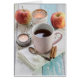 Wunderschönes Stillleben im Herbst aus einer Tasse Tee, romantischen Kerzen, Kerzenhalter, Äpfel und Vintagem Accessoires als Silberlöffel und Holzbrett als Hintergrund. Copyright © Uta Naumann 2017.