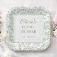 Elegante Pappteller für die Brautparty mit einem salbeigrünen französischen vintage Blumendesign. Entwickelt, um eine weiche, romantische Note auf den Tisch zu bringen und sich perfekt mit garteninspirierten und klassischen Dekorationen zu koordinieren. Ideal für Brautpartys, Mittagessen und Vorhochzeitsfeiern. Vollständig anpassbarer Text mit einem druckfertigen Design, geeignet für Party-Tischwäsche.
