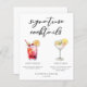 Cette feuille de papier de menu à cocktails chic et signature présente une typographie noire personnalisée au-dessus de 2 boissons et leurs ingrédients pour votre bar mariage. Un joli dessin à base de martini au citron et à la shirley Temple et au citron confèrent une touche cool à votre menu du bar. Complétez avec les noms du couple et la date de leur réception.