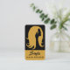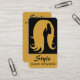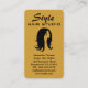 © Sunny Mars Designs. Ce carte de visite élégant, entièrement personnalisable coiffeur, coiffeur ou salon de coiffure présente la sillouette d'une femme aux beaux cheveux longs.