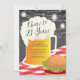 Salutations à 21 ans invitation barbecue avec une tasse de bière & burger ensemble sur un arrière - plan moderne en tableau noir avec lumières de mâchoire pendante