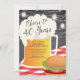Salutations jusqu'à 40 ans invitation barbecue avec une tasse de bière & burger ensemble sur un arrière - plan populaire de tableau noir avec lumières de pot de mason suspendu