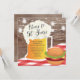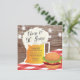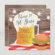 Salutations à 50 ans invitation barbecue avec une tasse à bière & burger sur un arrière - plan en bois rustique avec des lumières de mât suspendues