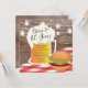 Salutations à 60 ans invitation barbecue avec une tasse à bière & burger sur un arrière - plan en bois rustique avec des lumières de mât suspendues