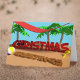Salutations de Noël sur la carte de voeux de plage. Carte de voeux amusante et colorée à envoyer si vous passez Noël sur la plage cette saison des Fêtes. La carte est constituée de palmiers, d'un hamac, d'un beach-volley et d'un pique-nique. Le Noël porte aussi des lunettes de soleil car il fait très ensoleillé.