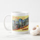 Salutations de nouvel Orlean, tasse vintage Louisianan de carte postale de grand-lettre. La carte postale paraît des deux côtés de la tasse.