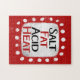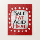 "Salt Fat Acid Heat" ist ein lustiges Textdesign mit weißer Akzent-Form, umgeben von weißen, weißlichen, weißlichen, weißgetönten Punkten.