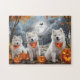 Entfesseln Sie den unheimlichen Geist mit diesem unheimlichen Halloween-Design, das eine Hundepackung unter einem dunklen, mondbeleuchteten Himmel bietet, umgeben von fliegenden Fledermäusen und glühenden Kürbissen. Ideal für diejenigen, die mit ihren wütenden Freunden eine Touch voller Furcht Liebe haben!