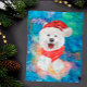 Samoyed Rasse Hunde Weihnachten zeigt eine Aquarellfarbe von Samoyed mit einem roten Weihnachtshut, einem roten Weihnachtsschal und einer galaxischen Aquarell.