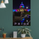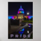 Ein nächtliches Foto erfasst das San Francisco City Hall, das in lebhaften Regenbogenfarben gebadet wird. Die mit der LGBTQ+-Stolperflagge geschmückte ikonische Kuppel hebt sich vom dunklen Himmel ab. Die Fassade des Gebäude ist farblich beleuchtet, wodurch ein blendendes Display entsteht. Im Vordergrund reflektiert ein reflektierender Pool die bunten Lichter und verleiht der Szene eine ruhige und ätherische Touch.