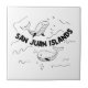 Einfaches Karikaturendesign mit Wales, Blasen und Wellen und "San Juan Islands" in fett geschriebenem Text.