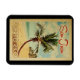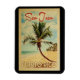 Ein einzigartiges Retro Mitte des Jahrhunderts moderne San Juan Puerto Rico Kunstdruck in Vintage Reise Poster Stil. Es verfügt über eine geschwungene Palme am Sandstrand mit Ozean unter einem blauen bewölkten Himmel.