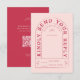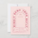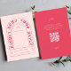 Dieses Hochzeitsdesign zeichnet sich durch gewölbte Typografie in einem funky Vintagen inspirierten Schriftart aus. Der Schriftart hat ein spielerisches und Retro-Gefühl und fügt der Einladung eine einzigartige Touch hinzu. Die Farbpalette des Designs ist eine lebendige Magenta und rot rosa, die eine warme und romantische Atmosphäre schafft. Die Kombination aus der gewölbten Typografie und dem Vintagen Schriftart verleiht der Einladung ein stilvolles und einzigartiges Aussehen. Bieten Sie Ihren Gästen die Möglichkeit, online mit Ihrem eigenen QR-Code zu scannen, um mit ihren Handys auf der Rückseite dieser RSVP-Karte.