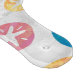 Trendy Sand Dollar Seamless Pattern in Gelb, Rot und Blau zeigt unser originelles Design von verschiedenen Größen und Farben überlappenden Sand Dollars in einem flachen grafischen Stil mit unserer Signatur Textur auf einem texturierten weißen Hintergrund.