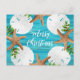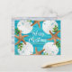 Weihnachtskarte zum Thema Strand mit Seestern und Sand Dollar Design. Fügen Sie Ihre Auswahl an Gruß auf die Vorderseite. "Frohe Weihnachten" ist die Musterformulierung, mit einem Platz für zusätzliche Nachricht und Unterschrift auf der Rückseite. Ein blauer Wasserhintergrund und ein Muschelkranz bilden den Hintergrund für das weiße Skript. Mehr Wasser bildet den Hintergrund auf der Rückseite.