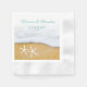 Zwei Seesterne und Strand und eigene Hochzeitsnapkins. Hochzeitsdusche oder Empfang-Papierservietten mit einem Platz für die Namen der Braut und Bräutigam und Datum der Ehe. Weißer Schaum auf dem Sand ist das Hintergrundbild für den blau-grünen Skripttext.