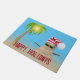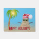 Weihnachtssandschneemann mit Sonnenbrille und gestreifter Kappe im Strand Sand mit Sonnenlicht auf Palmen. Text kann geändert werden.